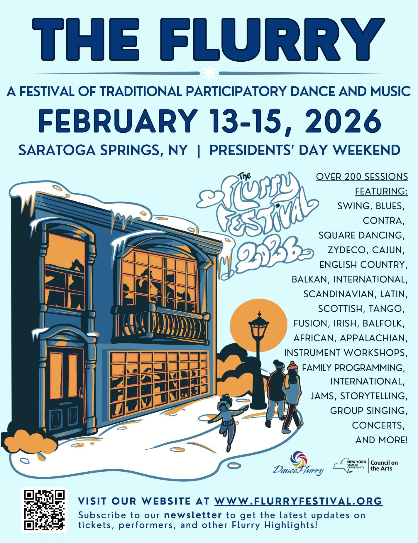 WHAT: The Flurry Festival is a celebration of music and dance from America and around the world, with genres including swing, blues, contra, square dancing, Cajun, Zydeco, English country, Balkan, Scandinavian, Latin, waltz, Scottish, fusion, international, Irish, balfolk, African, Appalachian, Asian, Haitian, hip hop, techno contra, and more. Participants come to dance, watch, listen, or participate in a variety of dances, workshops, and concerts, including dance lessons, singing sessions, instrument workshops, scheduled and impromptu jam sessions, yoga, crafts, and family events for all ages.