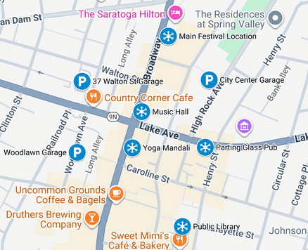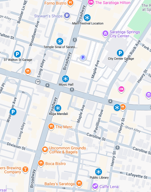Saratoga Music Hall: One block south on Broadway. Please use side entrance by ramp.